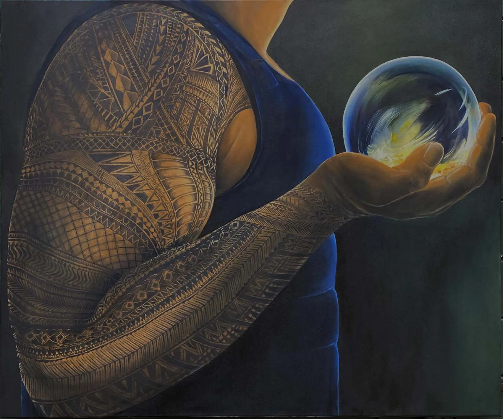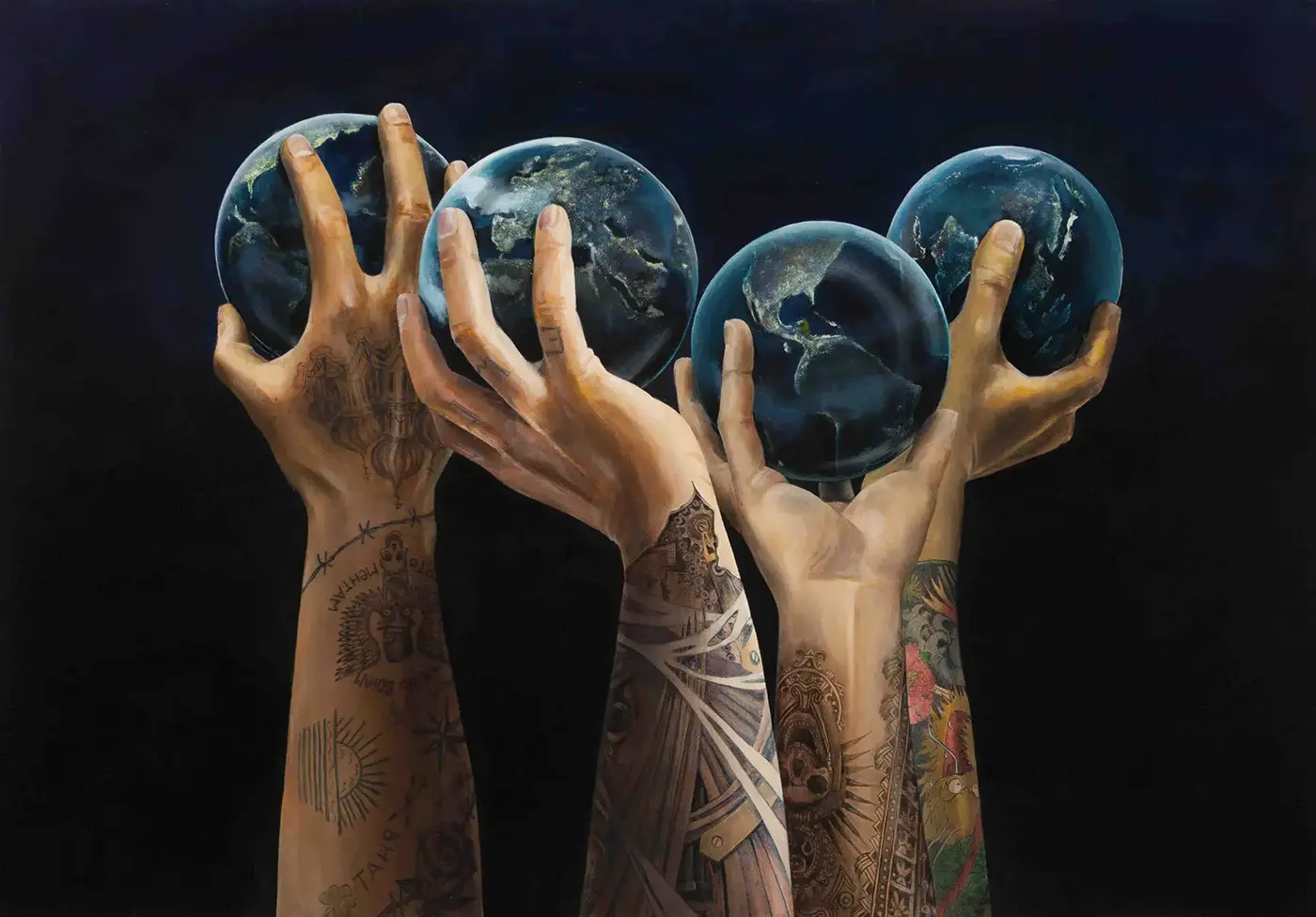 Die Reihe «Die Welt hinter der Welt» von Nina Herold, Künstlerin in Bonn, zeigt, was sich unter einer scheinbar ruhigen Oberfläche abspielt: Macht, Herkunft, Glaube, Identität und die inneren Kämpfe des Menschen. Weltkugeln in tätowierten Händen verweisen auf globale Geflechte von Einfluss, Loyalität und Verbrechen – Zeichen und Codes aus Russland, Europa, Mexiko und Japan verraten Zugehörigkeit und Rang.
