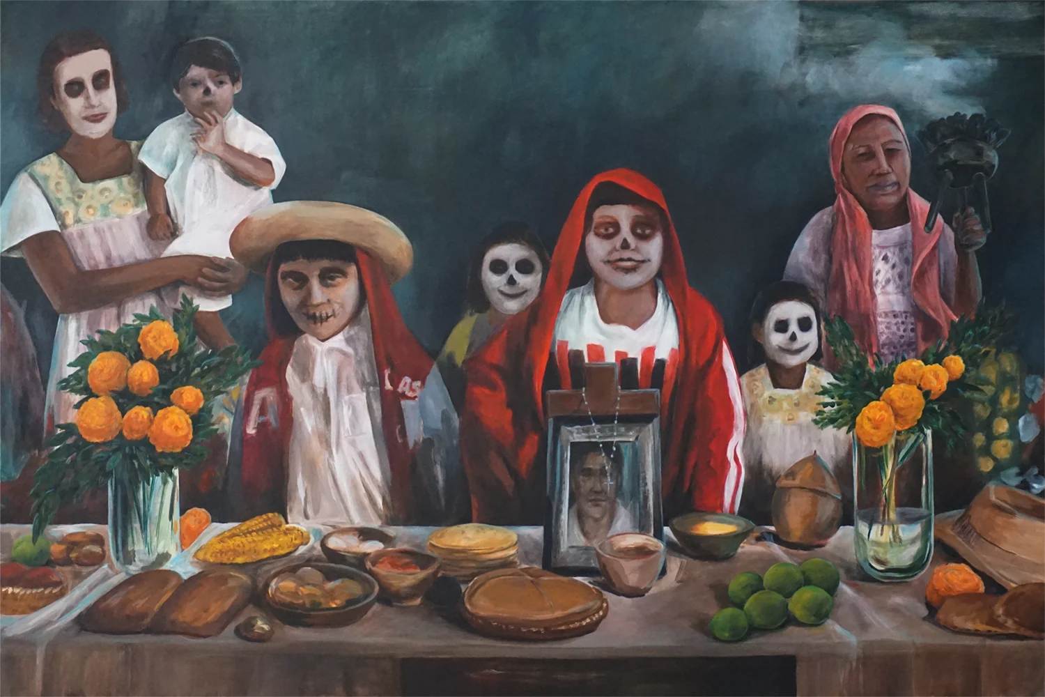 In anderen Bildern tauchen Heilige der Unterwelt aus Südamerika auf, etwa Santa Muerte oder Malverde, Symbolfiguren für Schutz, Gefahr und einen möglichen Neuanfang. Ein grossformatiges, fast surreal wirkendes Portrait, angelehnt an eine Selbstfotografie ihres Grossvaters, berührt Themen wie Geheimnisse, Vergangenheit und die Frage nach dem eigenen Namen.