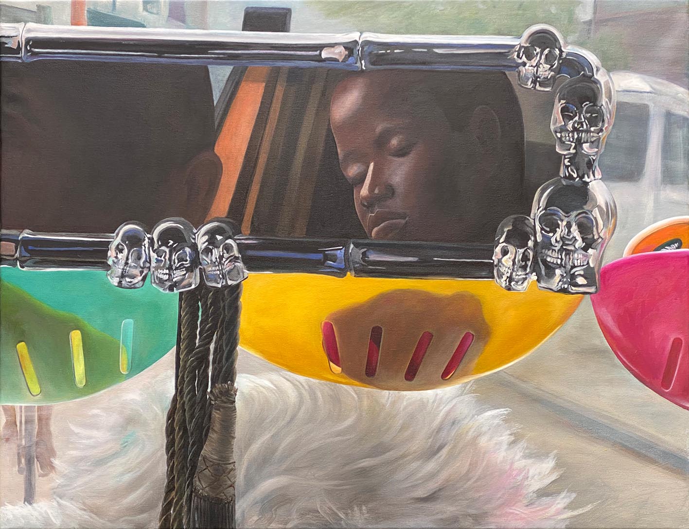 Schliesslich rückt auch die Corona-Zeit ins Zentrum ihrer Malerei: eine Phase, in der Welten und Zukunftsbilder ins Wanken gerieten und Menschen nach Orientierung suchten. Māori-Tätowierungen stehen hier für Stärke und Zusammenhalt, während in einer rasenden Lichtkugel Zukunft, Universum und Ungewissheit aufeinanderprallen.